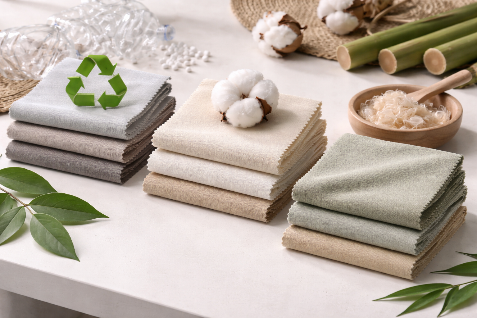 Recycled polyester, organic cotton, and bamboo fabrics are widely used.